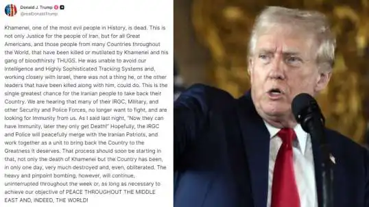 ट्रंप ने खामेनेई की मौत को ईरानी नागरिकों के लिए अपना देश वापस पाने का अब तक का सबसे अच्छा मौका बताया। उन्होंने दावा किया कि ईरान की IRGC, पुलिस और सुरक्षाबलों के तमाम लोग अब लड़ना नहीं चाहते है। वह अमेरिका से छूट मांग रहे हैं। इस पर ट्रंप खुली चेतावनी देते हुए बोले अभी माफी मिल सकती है, लेकिन बाद में उन्हें केवल मौत मिलेगी!