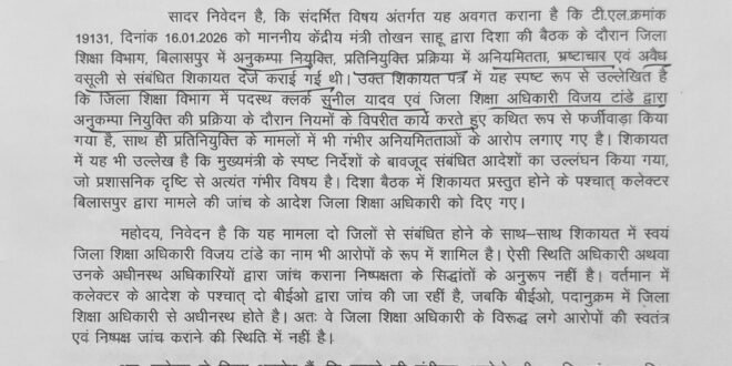 गौरतलब है कि इस मामले में पहले भी केंद्रीय मंत्री तोखन साहू द्वारा कलेक्टर को जांच के निर्देश दिए गए थे। कलेक्टर के आदेश के बाद जिला शिक्षा अधिकारी ने अपने स्तर पर जांच के निर्देश जारी किए थे, लेकिन उस जांच प्रक्रिया को लेकर भी सवाल उठाए जा रहे हैं।