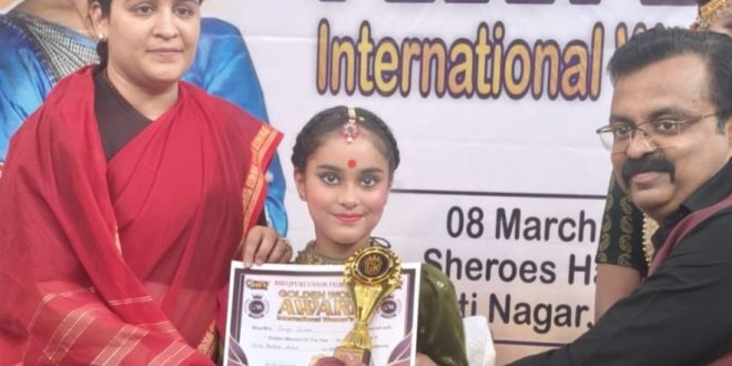 लखनऊ : : अंतरराष्ट्रीय महिला दिवस के अवसर पर शहर में आयोजित गोल्डन वीमेन अवार्ड शो में लखनऊ की नन्ही कथक नृत्यांगना गार्गी द्विवेदी को उनके उत्कृष्ट प्रदर्शन के लिए सम्मानित किया गया। उन्हें यह सम्मान उत्तर प्रदेश महिला आयोग की उपाध्यक्ष श्रीमती अपर्णा बिष्ट यादव द्वारा प्रदान किया गया।
