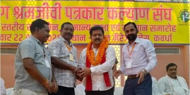 कवर्धा : : (छत्तीसगढ़) : : मेंविगत 22 मार्च 2026 को छ.ग. श्रमजीवी पत्रकार कल्याण संघ द्वारा कवर्धा में भव्य आयोजन एवं चुनाव एवं सम्मान समारोह में छत्तीसगढ़ के उपमुख्यमंत्री विजय शर्मा मुख्य अतिथि के रूप में शामिल हुए। इस दौरान उन्होंने प्रदेशभर से आए पत्रकारों का सम्मान किया और उनके कार्यों की सराहना की।