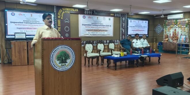 3.4.2026 को अटल बिहारी वाजपेई विश्वविद्यालय बिलासपुर में जिले के सभी विद्यालय एवं महाविद्यालय के राष्ट्रीय सेवा योजना इकाई के प्रभारियों के एक सप्ताह के प्रशिक्षण कार्यक्रम अंतर्गत आज पुलिस उप महानिरीक्षक एवं वरिष्ठ पुलिस अधीक्षक राजनेश सिंह के दिशा निर्देश एवं यातायात बिलासपुर के अतिरिक्त पुलिस अधीक्षक रामगोपाल करियर के मार्ग निर्देशन में यातायात की पाठशाला का आयोजन किया गया। जिसमें उपस्थित विश्वविद्यालय एवं महाविद्यालय के सभी अध्यापकों को सड़क सुरक्षा के नियम, सड़क दुर्घटना के कारण ,निवारण, तथा राहगीर योजना के साथ-साथ ITMS की सविस्तार जानकारी दी गई ।