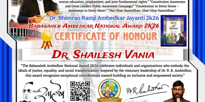 14 अप्रैल 2026 डॉ. भीमराव अंबेडकर जी की जन्म जयंती के अवसर पर सोशल एकता फाउंडेशन ऑर्गनाइज़ेशन द्वारा “बाबासाहेब अंबेडकर नेशनल अवॉर्ड 2K26 खंभोलज साहित्य सेवा संस्था के राष्ट्रीय अध्यक्ष डॉ शैलेष वाणिया ‘शैल’ को ऑनलाइन दीया गया। यह अवॉर्ड उन लोगों और ऑर्गनाइज़ेशन को सम्मानित करता है। जो न्याय, बराबरी और सामाजिक बदलाव के आदर्शों को अपनाते हैं। डॉ. बी. आर. अंबेडकर की दूर की सोचने वाली लीडरशिप से प्रेरित होकर, यह अवॉर्ड डॉ शैलेष वाणिया शैलजी सबको साथ लेकर चलने वाले और मज़बूत समाज बनाने की दिशा में उनके असाधारण योगदान को पहचान देता है।संस्था उनके उज्जवल भविष्य की कामना करते हैं। एकता फाउंडेशन सामाजिक संगठन Reg. No. F-336/2018 संस्थापक अध्यक्ष डॉजयसंजयरामटेकमुंबई,महाराष्ट्र9075777101/9075777102