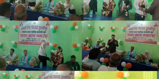 बलरामपुर/ तुलसीपुर : : 16 अप्रैल : : आदर्श नगर पंचायत तुलसीपुर सभागार में प्रदेश शासन द्वारा मनोनीत सदस्यों (सभासदों) का शपथ ग्रहण समारोह मैं श्रीमती सिद्धेश्वरी कसौधन सुनील सोनी सूरज मोदनवाल को पद और गोपनीयता की शपथ एसडीएम तुलसीपुर राकेश कुमार जयंत द्वारा दिलाई गई इस मौके पर तुलसीपुर स्थानीय विधायक कैलाश नाथ शुक्ला मुख्य अतीत के रूप में उपस्थित रहे वहीं नगर पंचायत अध्यक्ष श्रीमती कहकशां फिरोज ,अधिशासी अधिकारी प्रवीण कुमार दुबे अदनान फिरोज, विष्णु देव गुप्ता, श्याम अग्रहरि रूपचंद गुप्ता रामकुमार गुप्ता विजय प्रताप सोनी शिव कुमार वाल्मीकि सहित दर्जनों गणमान्य नागरिक उपस्थित रहे हैं।