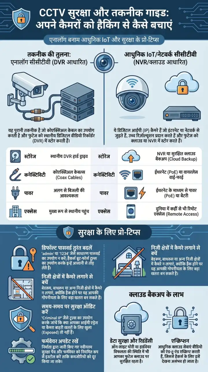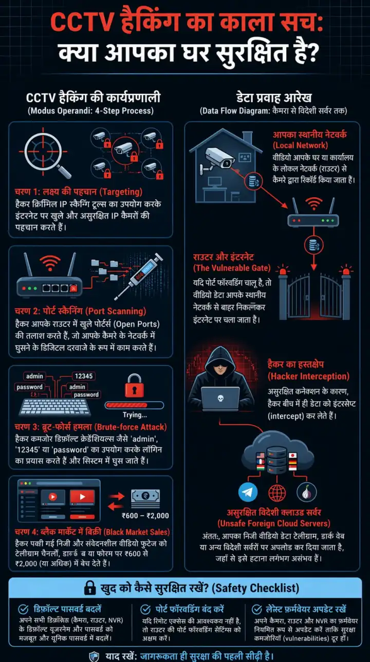 q]पुराने और आज के जमाने के सीसीटीवी कैमरों में क्या अंतर है?[/q] [ans]पुराने जमाने के सीसीटीवी कैमरे बहुत साधारण थे. उनमें वीडियो लोकल डीवीआर या एनवीआर नाम के छोटे बॉक्स में सेव होता था. लेकिन आज का सीसीटीवी ‘इंटरनेट ऑफ थिंग्स’ (IoT) टेक्नोलॉजी पर चलता है. खासकर सोलर-पावर्ड वायरलेस कैमरे, जैसे दिल्ली पुलिस ने हाल में पकड़े हैं.[/ans] [q]नए सीसीटीवी कैमरा असल में किस तरह से काम करते हैं?[/q] [ans]ये कैमरे पूरी तरह से वायरलेस होते हैं. इनके ऊपर छोटा सा सोलर पैनल लगा होता है. दिन में सूरज की रोशनी से बैटरी चार्ज हो जाती है. एक बार चार्ज हो जाने पर यह 24 घंटे चलता रहता है. कैमरे में 4G या 5G सिम कार्ड लगता है. सिम से इंटरनेट कनेक्शन मिलता है. कैमरा वीडियो कैप्चर करता है. इसमें लेंस, सेंसर, माइक्रोफोन सब होता है. वीडियो ऑटोमैटिक कंप्रेस हो जाता है, ताकि इंटरनेट पर आसानी से जा सके. फिर इसे क्लाउड स्टोरेज या पीयर टू पीयर टेक्नोलॉजी से भेज दिया जाता है.[/ans] [q]इंटरनेट से चलने वाले सीसीटीवी कैमरे कंपनी के सर्वर से कैसे जुड़ते हैं?[/q] [ans]आज आप कोई भी सीसीटीवी कैमरा खरीदें, सभी कैमरे क्लाउड बेस्ड् होते हैं. पूरा वीडियो या लाइव फीड कंपनी के सर्वर पर जाता है. कैमरा ऑन होते ही कंपनी के सर्वर से ‘हैलो’ कहता है. हर कैमरे में एक यूनिक आईडी और पासवर्ड होता है. कैमरा कंपनी के क्लाउड सर्वर जुड़ जाता है. ज्यादातर चीनी कंपनियां अपने सर्वर चीन में रखती हैं या क्लाउड में रखती हैं. भारतीय ब्रांड भी कभी-कभी विदेशी क्लाउड इस्तेमाल करते हैं. सर्वर पर वीडियो स्टोर होता है. कई बार फुटेज इन सर्वर से भी लीक हो जाती हैं.[/ans] [q]सीसीटीवी का फीड आपके मोबाइल तक कैसे पहुंचता है और बीच में खेल होने की क्या गुंजाइश है?[/q] [ans]साइबर एक्सपर्ट्स के अनुसार, सीसीटीवी कैमरों से फीड इंटरनेट की मदद से कंपनी के सर्वर में जाता है. इसके बाद, वहां से आपके फोन पर आता है. सीसीटीवी फुटेज देखने के लिए आपको खास ऐप की जरूरत होती है. कई बार यही एप आपके मोबाइल में मौजूद सभी पर्सनल डाटा चोरी कर कंपनी के सर्वर में पहुंचा देती हैं. ऐसे में हैकर्स के लिए सीसीटीवी हैक करना और साइबर क्राइम करना बेहद आसान हो जाता है.[/ans]