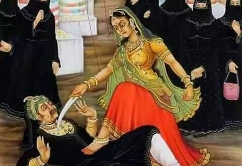 किरणदेवी ने कमर से कटार निकाली और अकबर को ऩीचे पटकर छाती पर पैर रखकर कटार गर्दन पर लगा दी ……..