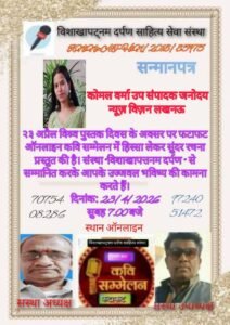 जिसके लिए कोमल वर्मा को सम्मान पत्र दिया गया है। जेडी न्यूज विजन को पूरी टीम ने कोमल जी को बधाई देते हुए इनके उज्ज्वल भविष्य की कामना की है।
