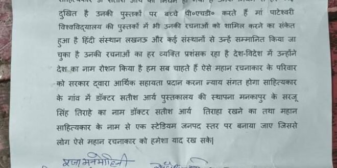 मनकापुर/ गोंडा: : जनपद गोंडा के साहित्यकारों ने प्रदेश के मुख्यमंत्री बाबा योगी आदित्यनाथ को रजिस्टर्ड पत्र भेजकर देश के जाने-माने साहित्यकार स्वर्गीय डॉक्टर सतीश आर्य के परिवार को आर्थिक सहायता प्रदान करने की मांग की है। साहित्यकारों ने उनके नाम से उनके ग्राम भिटौरा में डॉक्टर सतीश आर्य पुस्तकालय की स्थापना, मनकापुर के सरजू सिंह तिराहे का नाम डॉक्टर सतीश आर्य तिराहा करने तथा जनपद स्तर पर उनके नाम से एक स्टेडियम बनवाए जाने की मांग की है। साहित्यकारों के साथ-साथ नगर के बुद्ध जीवियों ने भी ऐसे कार्य किए जाने की अपील सरकार से की है। साहित्यकार डॉ सतीश आर्य एक महान साहित्यकार थे जिन्होंने पूरे देश में अपनी रचना के माध्यम से अपने प्रदेश का और अपने जनपद का नाम रोशन किया है, ऐसे रचनाकार की स्मृति में यह कार्य होना अत्यंत आवश्यक माना जा रहा है, ताकि आने वाली पीढ़ी उन्हें याद रख सके और उनसे प्रेरणा ले सके।