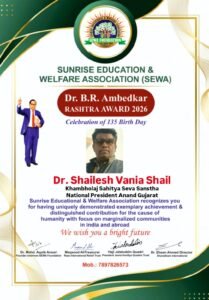 डॉ. बी.आर. अंबेडकर नेशनल अवॉर्ड 2026 डॉ. शैलेष वाणिया शैल को दिया गयाहै कल तारीख 25 अप्रैल को सनराइज एजुकेशन एंड वेलफेयर एसोसिएशन (सेवा) संस्था ने खंभोलज साहित्य सेवा संस्था के नेशनल प्रेसिडेंट डॉ. शैलेष वाणिया ‘शैल’ को ऑनलाइन डॉ. बी.आर. अंबेडकर नेशनल अवॉर्ड 2026 दिया गया ।